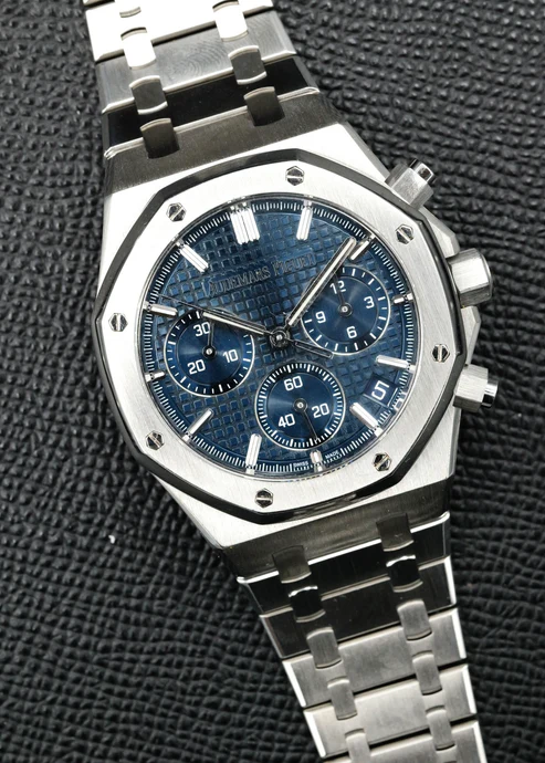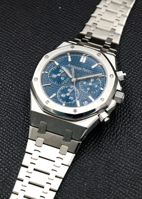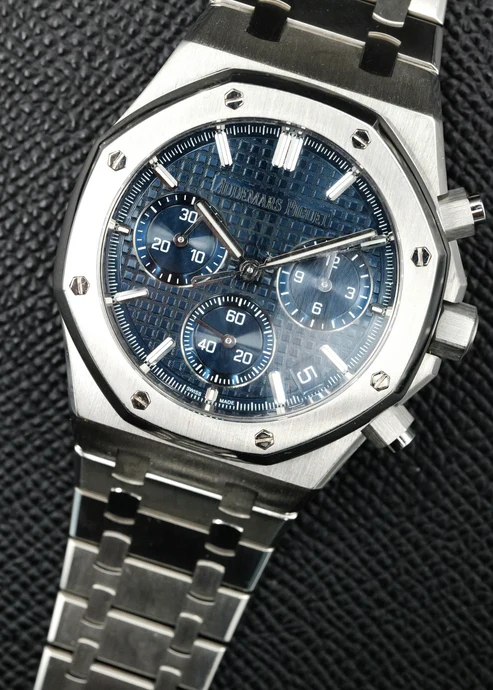 The AP Royal Oak Chronograph combines function and style with its newly updated blue dial and integrated bracelet by watchmaker Gerald Genta. Perfect for those seeking a sleek and elegant timepiece, stay on time and in style with this expertly crafted watch. Full set and like new.