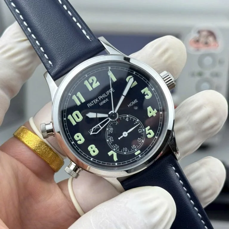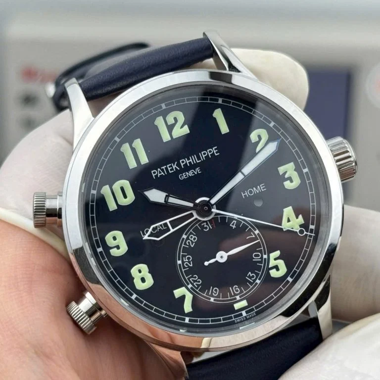 Dynamic and Bold: This Patek Philippe Calatrava Pilot Travel Time 5524G emanates a classic, elegant appeal with a modern twist. The blue dial, along with the white gold case and the luxurious leather strap, makes for an irresistible combination. Ideal for world travelers, it swiftly handles dual time zones with sheer perfection.