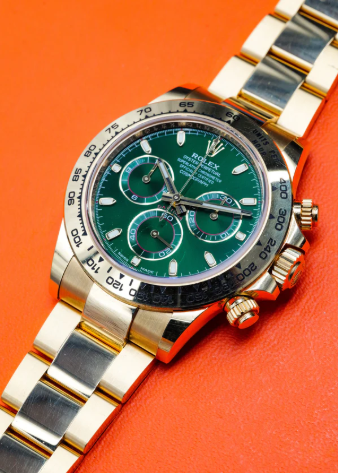 - Dial: The watch features a distinctive green dial, a rare departure from traditional colors in the Daytona lineup. This unique dial is complemented by gold sub-dials and markers, enhancing its readability while maintaining an elegant look.Buy Rolex watch