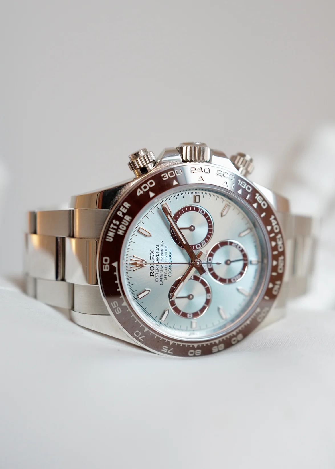 The 2024 Rolex Daytona 126506 Platinum “Platona” is a distinguished preowned timepiece, presented as a complete set including its original box and papers. Crafted in platinum, this model features an open caseback that offers a rare view into its intricate movement, embodying Rolex’s exceptional craftsmanship and sporty elegance. Ideal for collectors seeking exclusivity and investment potential, it combines technical mastery with iconic design in a truly unique Daytona edition.