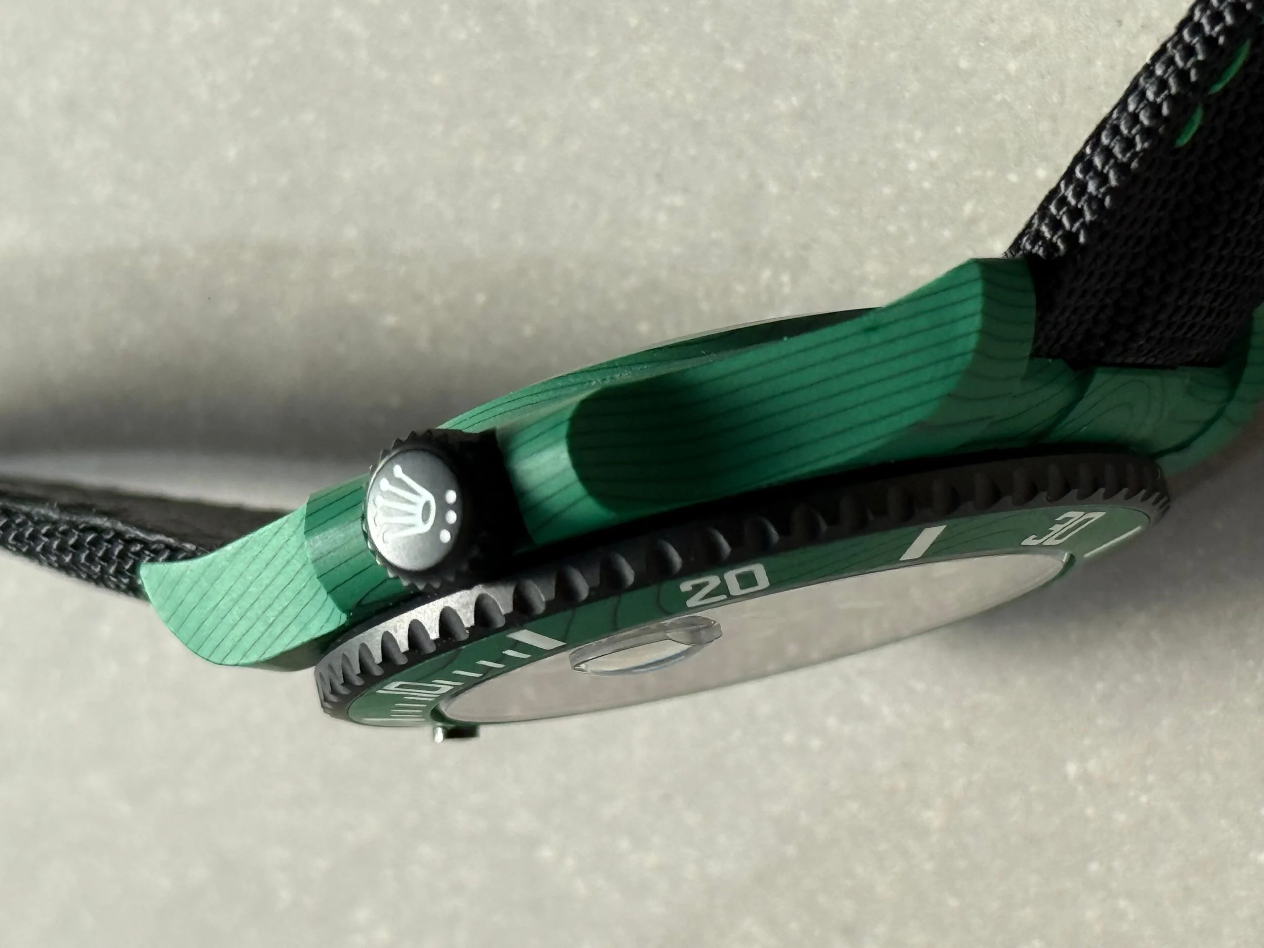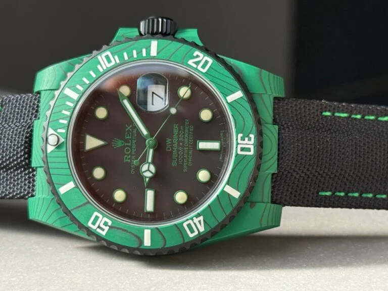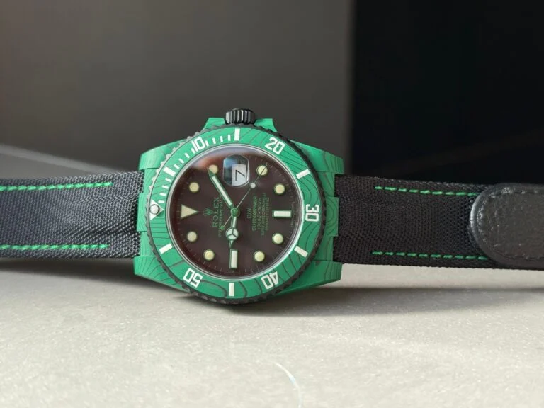 Iconic Styling: This VSF 1:1 Best Edition of Rolex Submariner Green Carbon impresses with its black dial and green carbon case, refined aesthetics, and the robust and high-performance VS3135 Super Clone movement. Perfect for the ambitious adventurer who seeks precision and uniqueness in a timepiece.