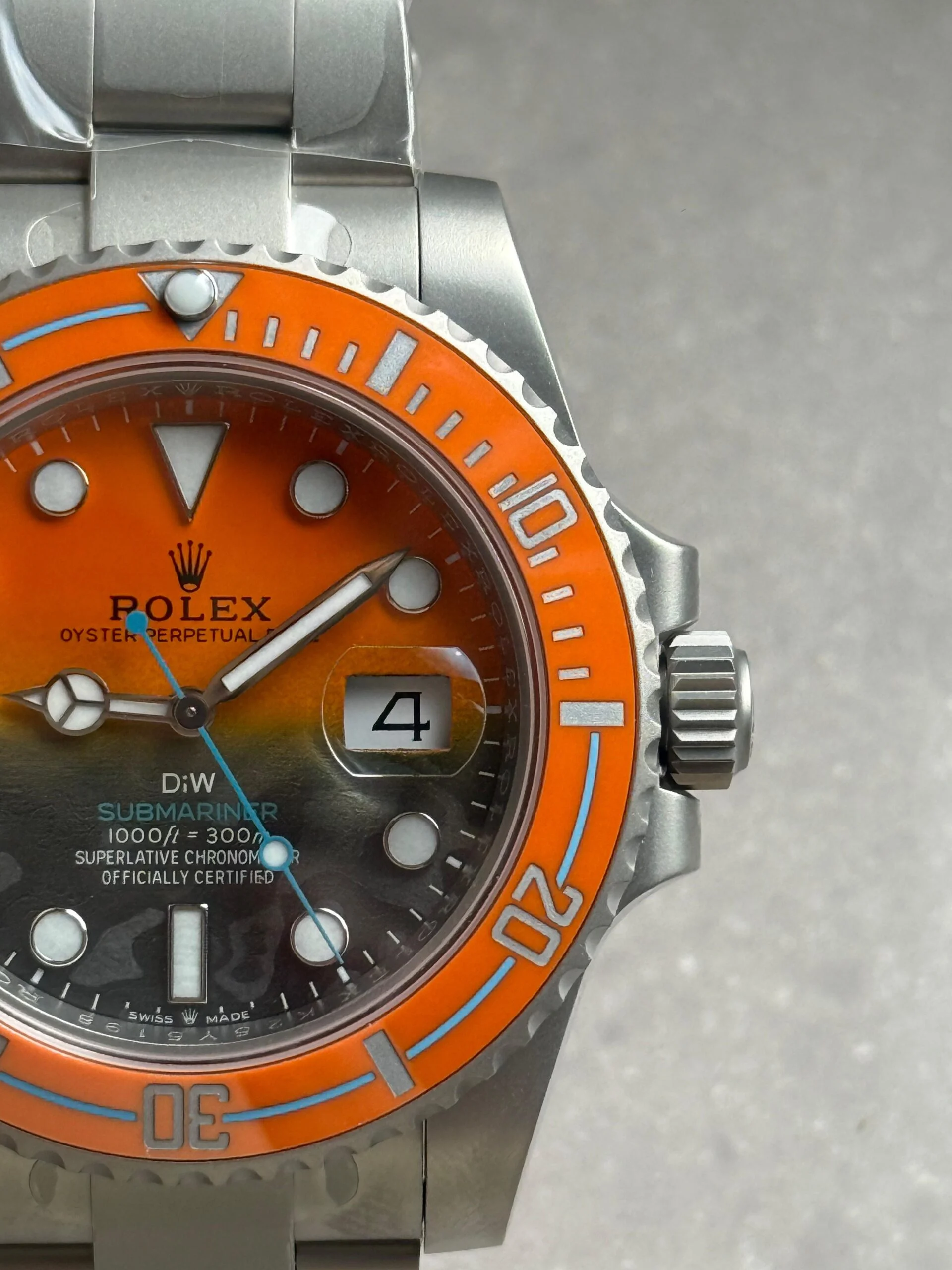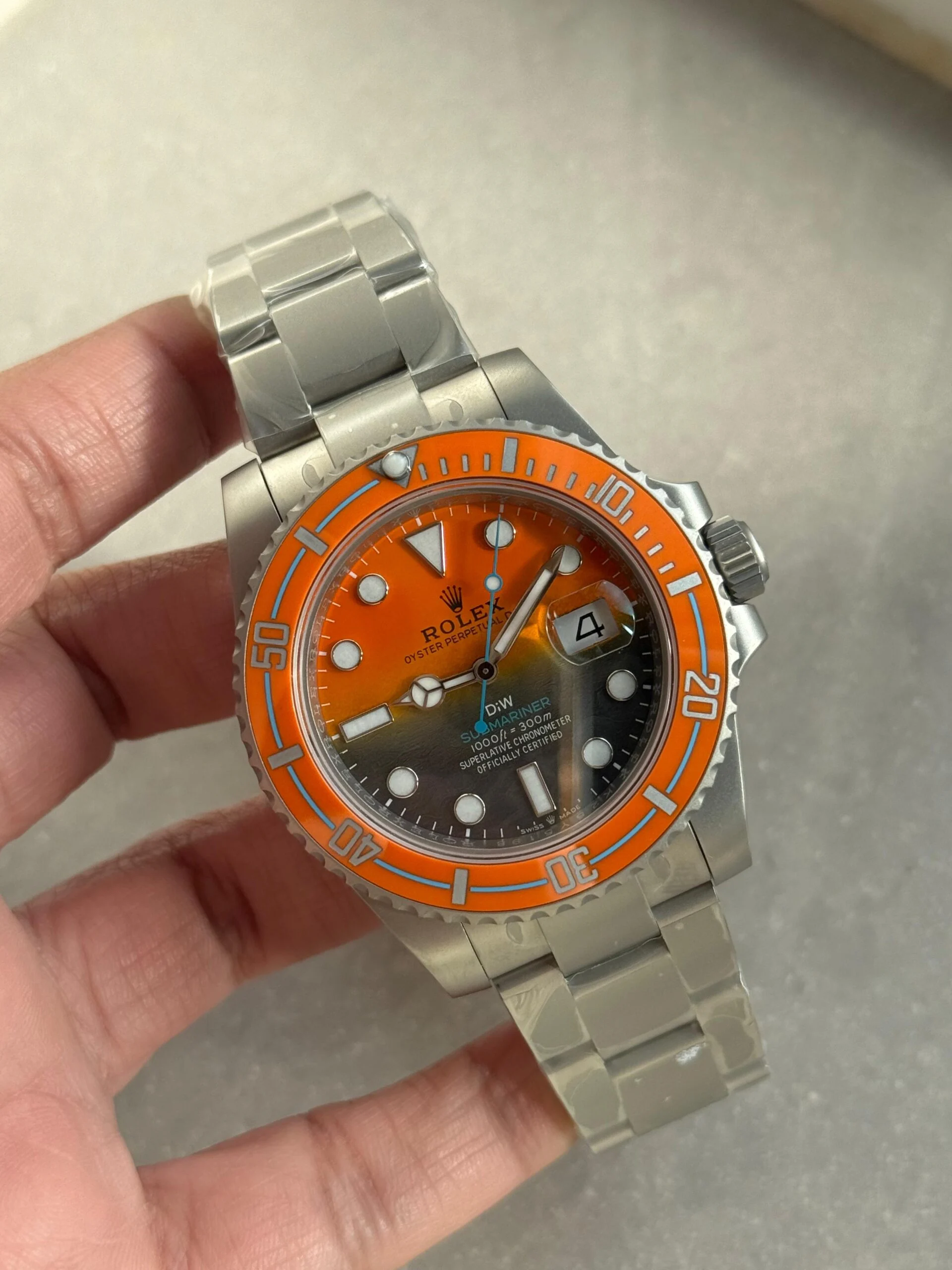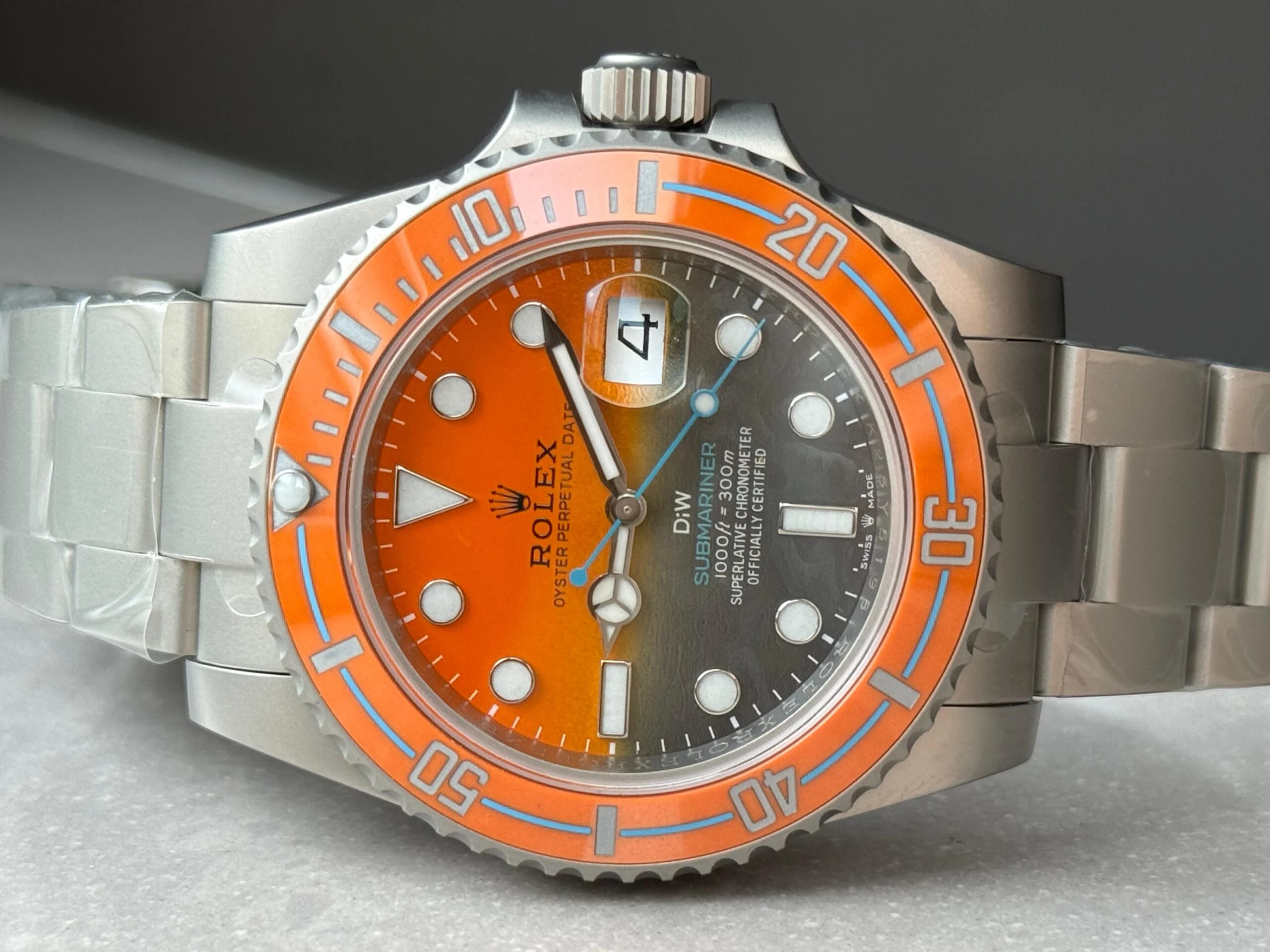 Iconic Styling: A stunning interpretation of the classic Rolex Submariner, this replica stands out with its eye-catching orange grey dial and sandblasted stainless steel case and bracelet. An absolute must-have for any watch enthusiast.
